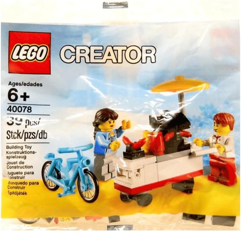 LEGO 40078 Hot Dog Stand was a 39 piece Creator set with 2 minifigs released in 2013. This set was a promotion item in LEGO stores and LEGO.com online with qualified purchases of $75 or more to LEGO VIP members.