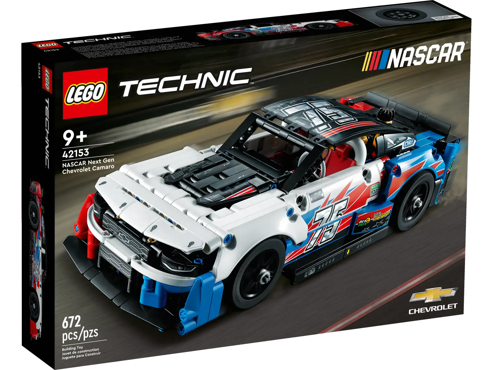 LEGO 42153 NASCAR Next Gen Chevrolet Camaro ZL1 was a 672 piece Technic set released in 2023. It is a 1:18-scale Technic ZL1 NASCAR car and features steering, an opening hood, and a V8 engine with moving pistons.