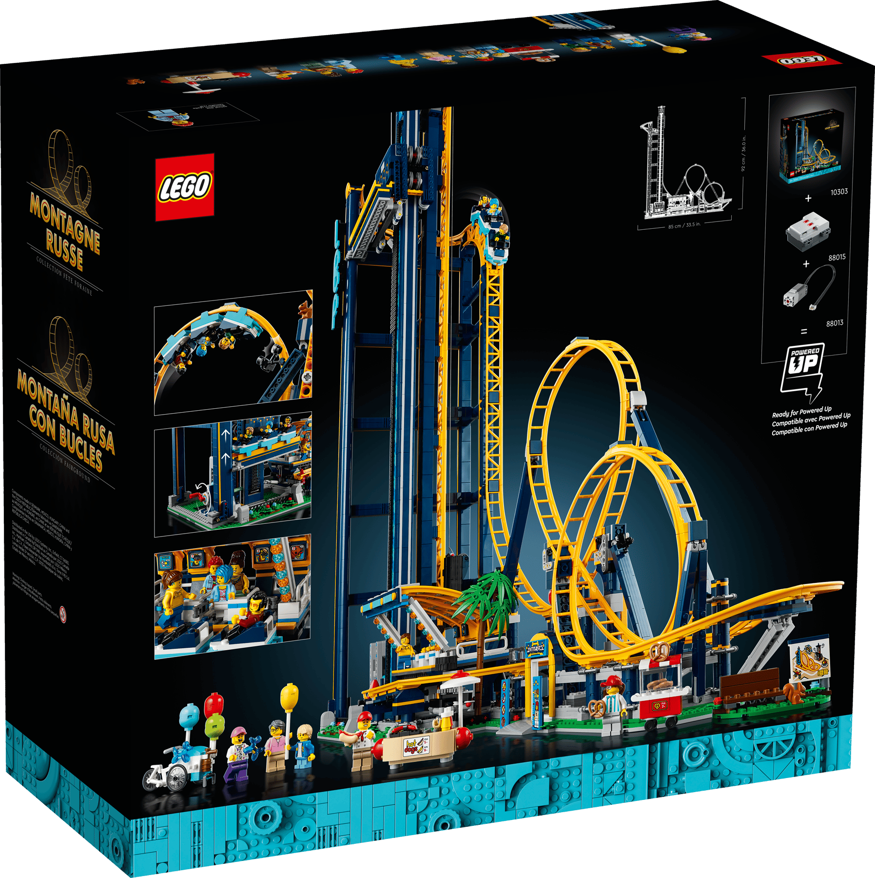 LEGO 10303 Loop Coaster is a 3,756 piece Icons exclusive set with 11 minifigs released in 2022. It features a functional gravity-driven roller coaster with loops and an elevator lift, and includes a train and a boarding station with operational barriers and a control panel. Accessories include a park bench, balloon cart, pretzel cart, and hot-dog stand.