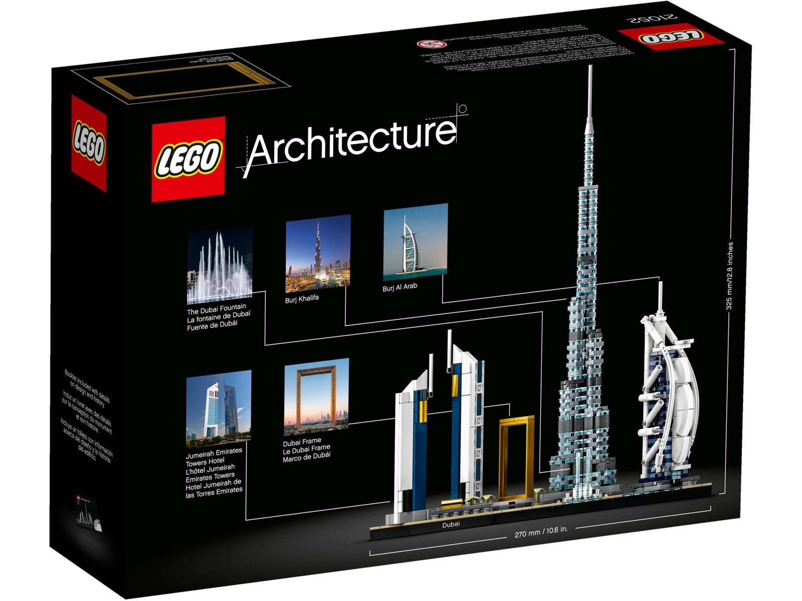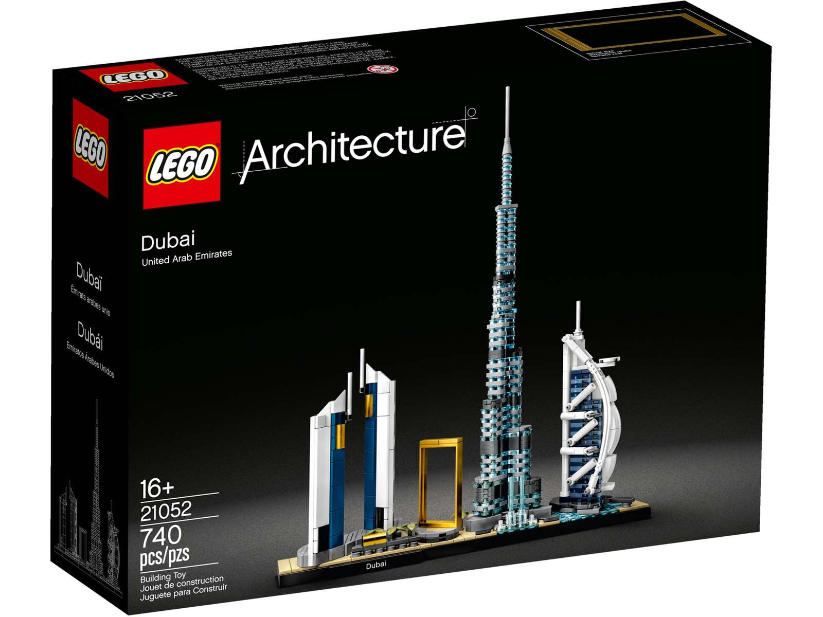 LEGO 21052 Dubai is a 740 piece Architecture set released in 2020. The set features the Burj Khalifa, Jumeirah Emirates Towers Hotel, Burj Al Arab Jumeirah hotel, Dubai Frame and The Dubai Fountain.