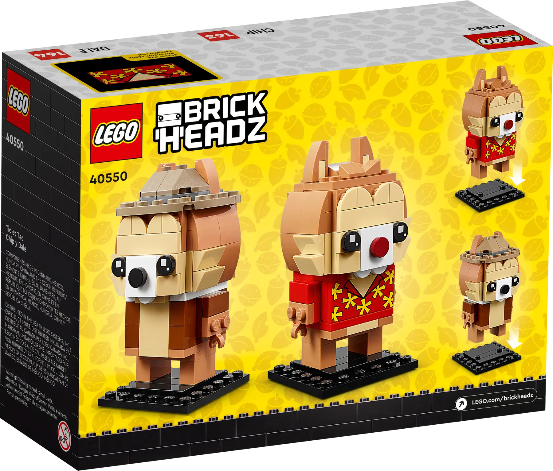 LEGO 40550 Chip & Dale is a BrickHeadz Disney set released in 2022, containing 226 pieces. The set builds two BrickHeadz figures of the chipmunk duo, designated BrickHeadz No. 163 (Chip) and No. 164 (Dale). It is based on Disney’s Chip ‘n’ Dale characters from the late-1980s Rescue Rangers cartoon and includes display baseplates for each build.