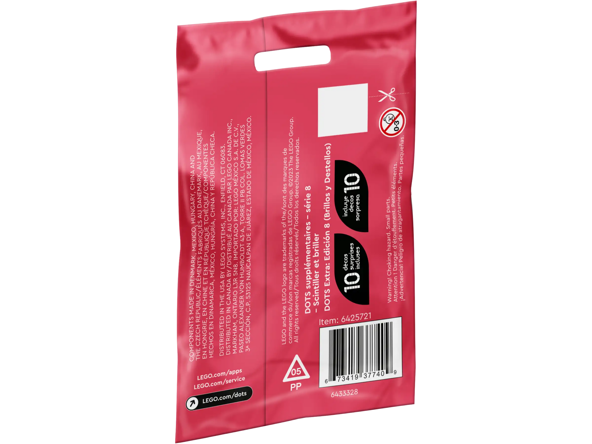 LEGO 41803 Extra Dots - Series 8 is a 105 piece Dots set released in 2023. It consists of a bag containing 105 tiles, including opalescent, glitter, and 3D-effect star tiles, as well as 10 graphic tiles from a range of 16 designs focused on themes like music, love, animals, and outer space.