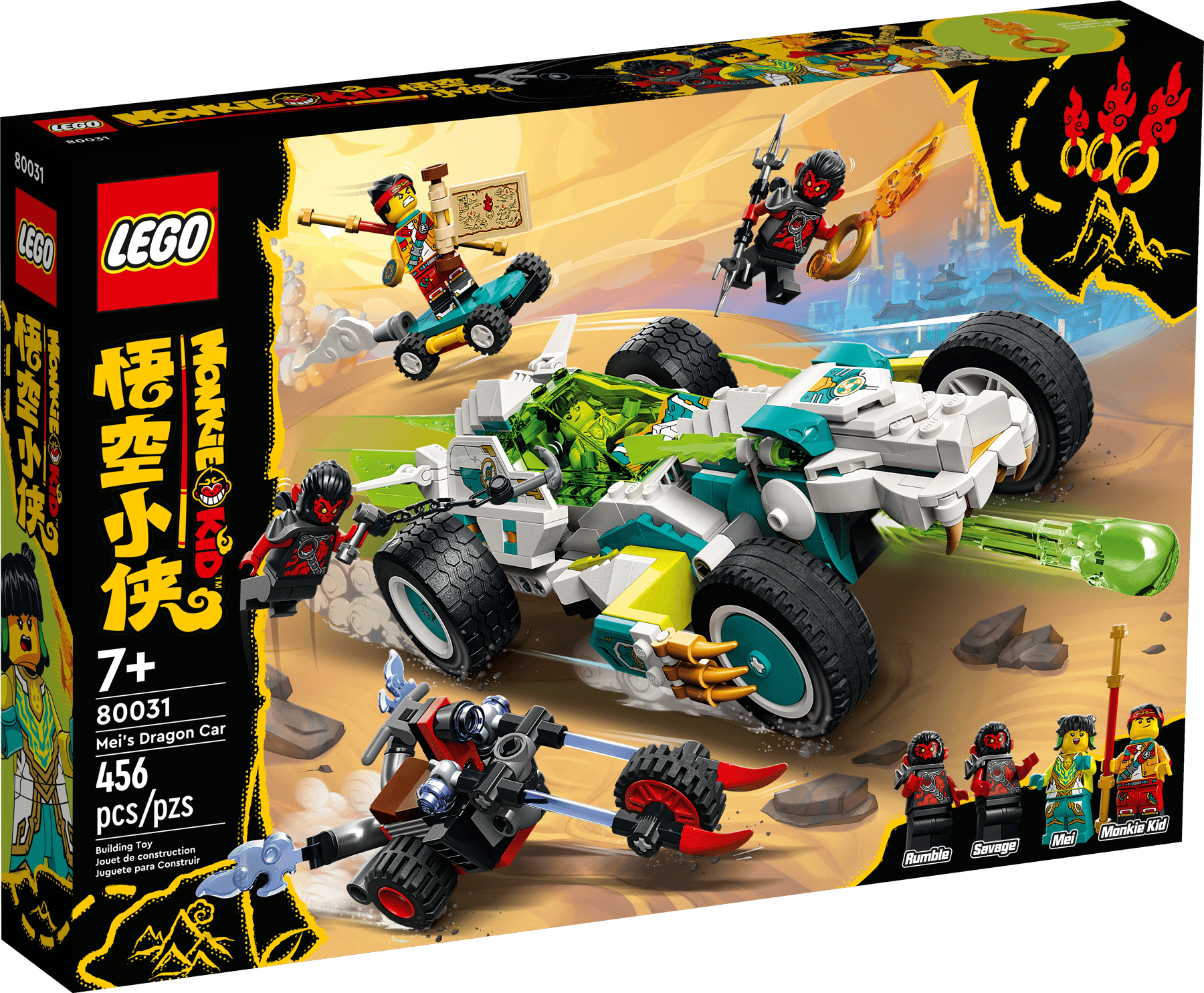 LEGO 80031 Mei's Dragon Car is a 456 piece Monkie Kid set with 4 minifigs released in 2022. It features Mei’s Dragon Car with a spring-loaded shooter, an opening cockpit, and neon-yellow elements. It includes Mei, Monkie Kid, and two Shadow Monkey minifigures, Monkie Kid's Cloud Board, and a Shadow Monkey trike.